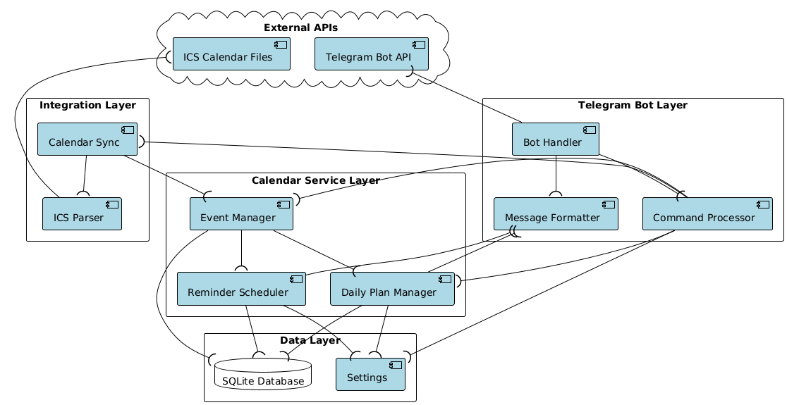 Self-hosted calendar bot that enables event CRUD operations via Telegram, sends customizable reminders/daily plans, and integrates with Google/Outlook calendars.